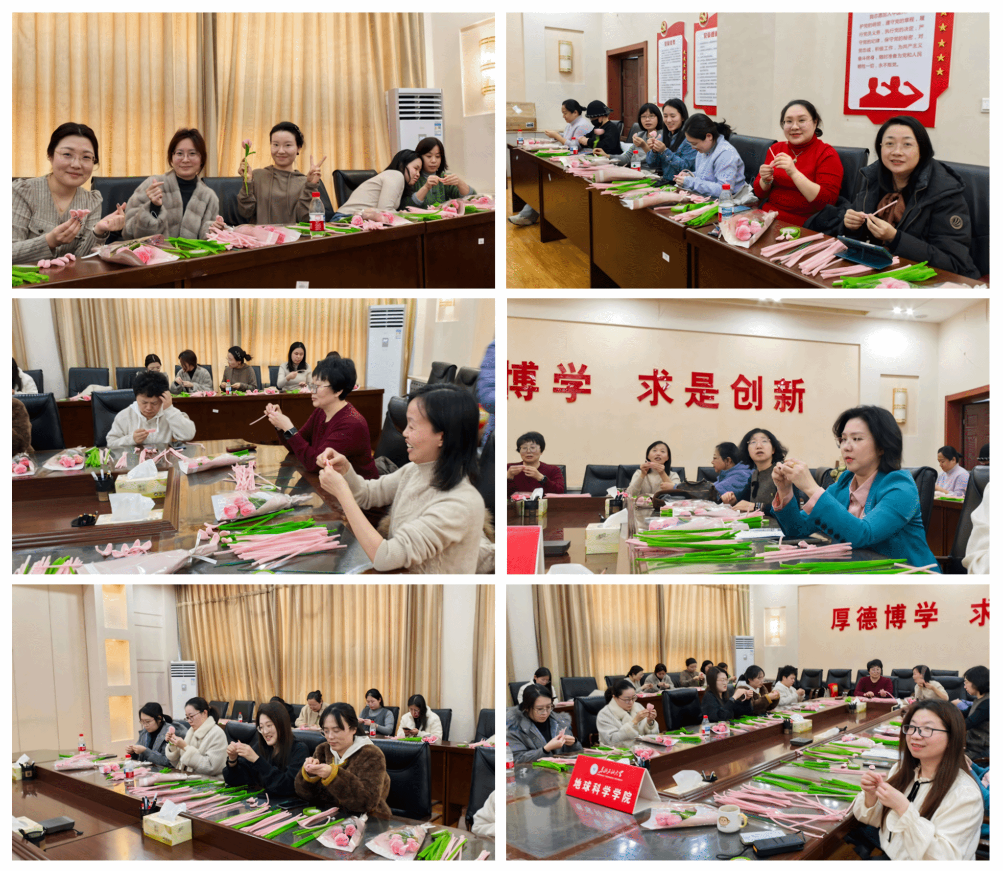 家风润心,花束传情。讲座结束后,温馨有趣的花束制作环节拉开帷幕。活动现场,教师们按照讲解,细致认真地研究每一个步骤,用巧手匠心打造每一支花朵,一朵朵郁金香错落有致,一束束作品清新雅致,现场暖意融融、笑语盈盈。大家手持精美花束作品合影留念,定格美好瞬间,在沉浸式体验中舒缓身心、增进情谊。