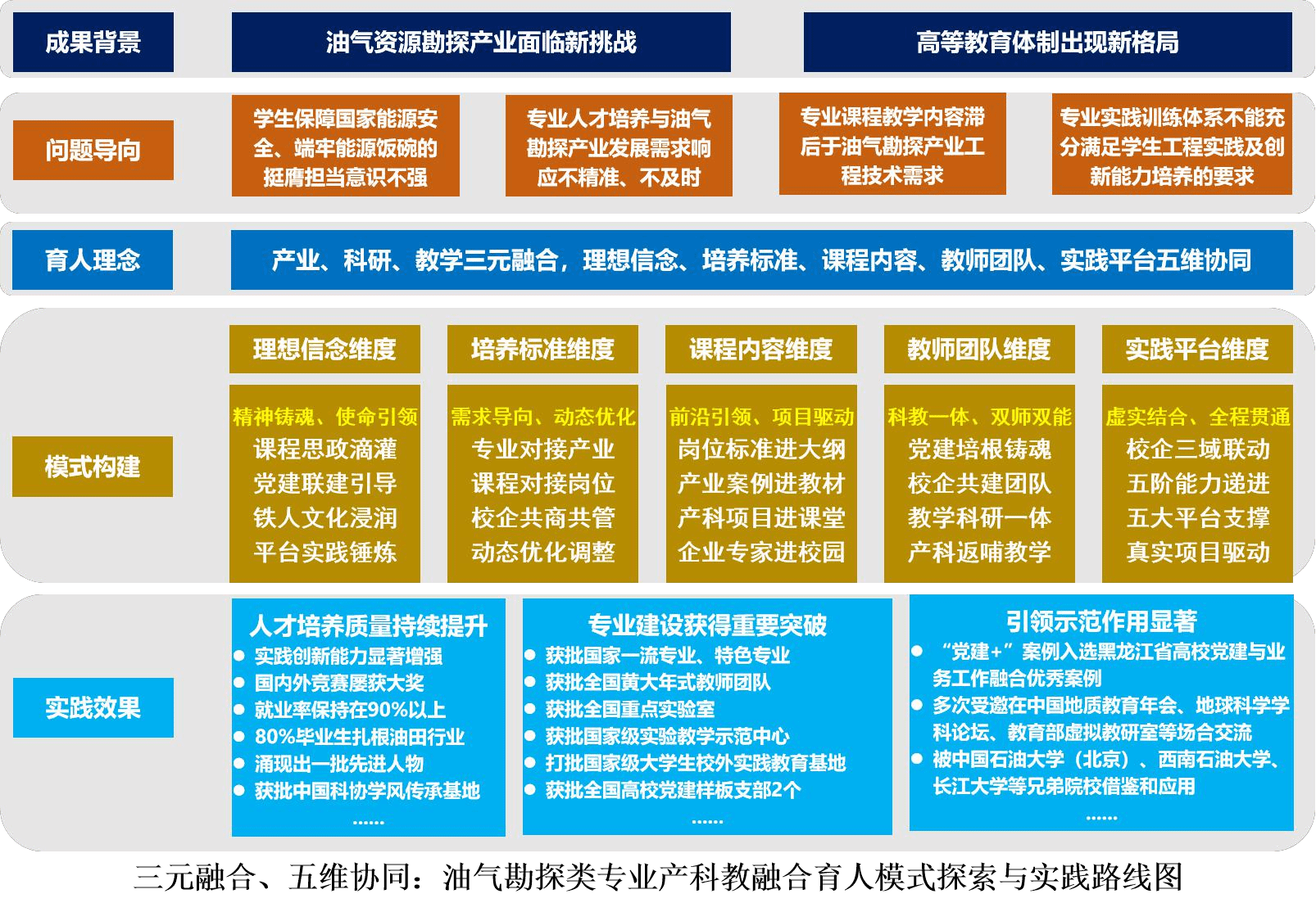 面对产业新形势和高等教育新格局,365上市公司依托油气勘探类优势专业65年的办学积淀,自2010年起以国家特色专业建设和黑龙江省专业综合改革为契机,充分发挥扎根大庆油田的区位优势,聚焦人才培养与产业需求精准对接,紧扣立德树人根本任务,整合校企双方优质资源,创新构建并实践了“三元融合、五维协同”的产科教融合育人新模式。该模式以产业、科研、教学三大要素深度融合为驱动,以理想信念、培养标准、课程内容、教师团队、实践平台五个维度协同共建为路径,系统构建产教融合、科教融汇系统育人新生态,着力培养堪当民族复兴大任、勇担能源强国使命的时代新人,为端牢国家能源饭碗提供坚实人才支撑。