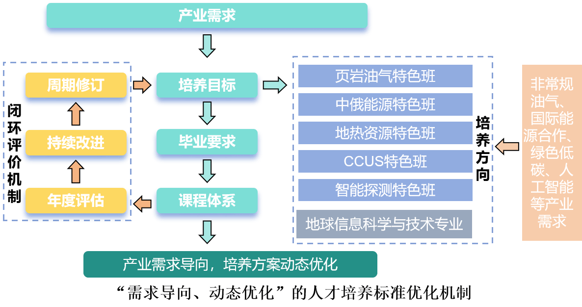 遵循“专业类对接产业链、专业对接产业、课程对接岗位”原则,构建“年度评估-持续改进-周期修订”的闭环优化机制,实施“产业需求→培养目标→毕业要求→课程体系”逆向设计路径。面向页岩油气、绿色低碳、人工智能等油气勘探新趋势,设立页岩油气、智能地球探测2个现代产业学院,开设5个新工科方向,新增“地球信息科学与技术”等2个专业。建立“1年微调、2年小调、4年大调”的动态修订机制,校企协同持续优化培养方案,确保人才输出与产业发展同频共振。