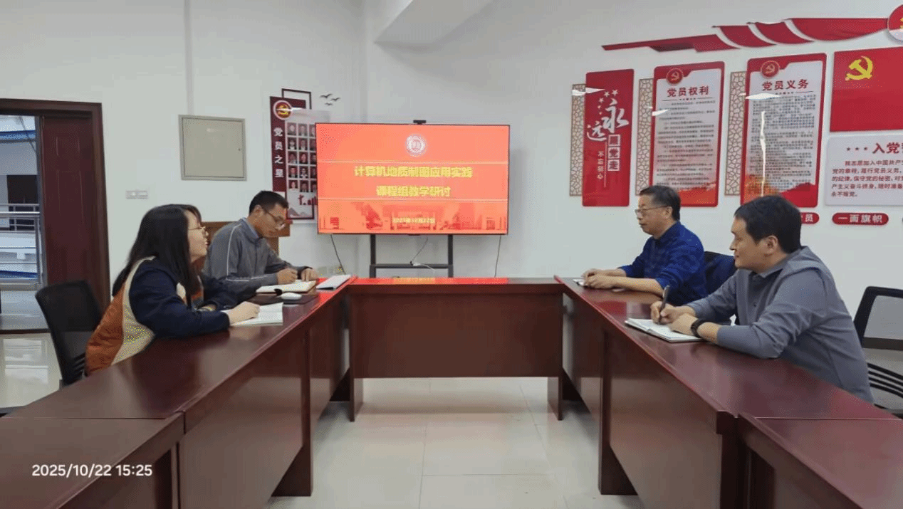 2025年10月22日,《计算机地质制图应用实践》课程教学团队在地科馆610开展了教学研讨活动。课程组成员王朋岩、胡欣蕾、魏华彬、杜先利参会,王朋岩主持会议。